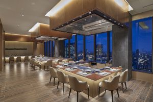 41階にはスカイチャペル・宴会場・料飲施設が配置され、各施設共に眺望を最大限に生かしたインテリアで構成し「The Okura」の新しいエポックの一旦を担う空間になるよう心懸けた。鉄板焼「さざんか」は 日本の“炎と陶”をコンセプトとした鉄板焼レストランで、窓面に配した陶板カウンター席を中心に、陶板アートとその素晴らしい眺望を充分に堪能できるようフードの高さや照明に気を配りながら計画している。
